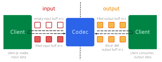 다음으로 할 작업은 디코더를 이용해 실제로 비디오 파일에서 영상 정보를 추출하는 것이다. 아래 그림은 MediaCodec에 관한 구글 개발자 문서에서 가져온 것인데, 코덱의 일종인 디코더는 영상을 가져올때 크게 input 작업과 output 작업을 거친다. 초록색으로 칠해진 클라이언트는 비디오에서 정보를 읽는 작업이고, 작은 정사각형을 채워넣는 작업은 앞서 클라이언트에서 읽어온 정보를 디코더 버퍼에 읽어온 채워넣는 작업이다. 이것 모두 개발자가 해야하는 일이다. 이 작업도 아래의 그림처럼 크게 두가지 단계로 정리해볼 수 있을 것 같다.
