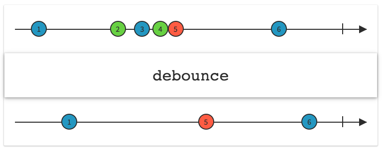 debounce 는 특정 시간이 지난 후에 마지막으로 들어온 이벤트만 받을 수 있는 오퍼레이터다. 글로 구구 절절 설명하는 것보다는 아래 그림으로 이해하는게 쉬울 것 같은데 아래 그림에서 최종적으로 받는 이벤트가 1, 5, 6인데 모두 입력됐을 때랑 입력으로 들어올 때랑 배출 될 때 사이의 구간 길이가 동일하다. 아래 그림에서 길이는 시간을 의미하기 때문에 둘다 동일한 시간이 지난 후에 이벤트를 받는 것으로 보면 된다. 그리고 5 이벤트가 들어오기 전에 2, 3, 4가 있었는데 최종적으로 5만 이벤트로 받게 되는데 이건 특정 시간이 지나기 전에 다른 이벤트들이 들어와서 그렇다. 그래서 2, 3, 4 이벤트는 모두 무시하게 된다.
