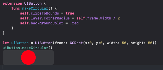 이런 경우 extension을 이용해 UIButton 클래스에 새로운 함수, makeCircular를 만들 수 있다. 이러면 앞서 둥근 버튼을 만들기 위해 실행한 코드를 하나의 함수에 넣고 호출하는 식으로 해결 할 수 있다. UIButton 클래스를 수정 할 수는 없지만 새로운 함수를 추가함으로써 가능한 방식이다.
